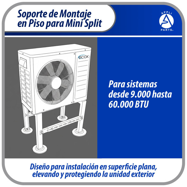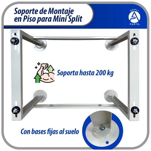 Appli Parts APAB-4440 Soporte de Montaje en Piso para Mini Split. Soporta 200 kg, Compatible desde 9000 a 60000 BTU, Incluye Gomas Antivibracion y Kit Completo de Instalacion. Extensible 56 a 100 cm