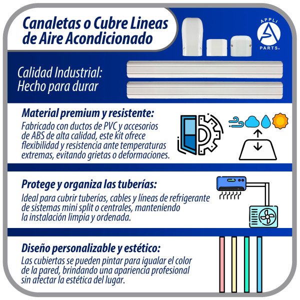 Appli Parts APLC-SET110 Cobertor para Lineas de Aire Acondicionado Juego de 100mm ancho, incluye: 2 Rectas, 1 Acople,1 Tapa Pared, 1 Tapa