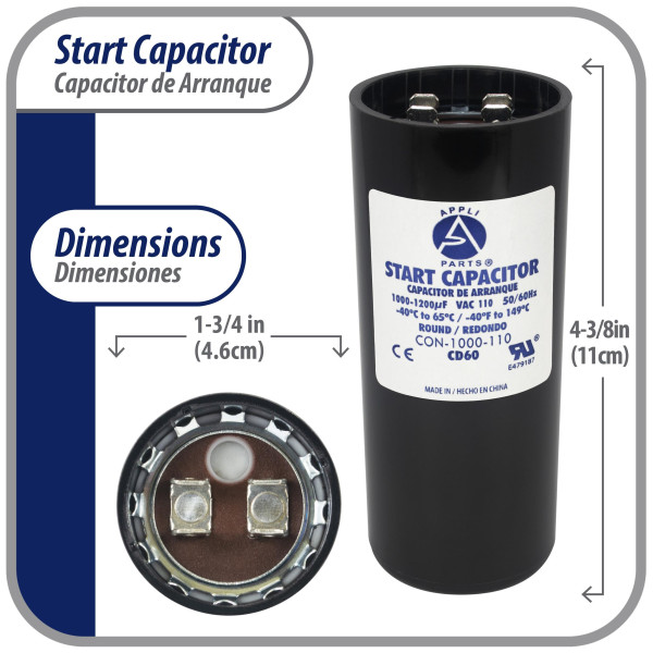Appli Parts CON-1000-110 Capacitor de Arranque 1000-1200 MFD (microfaradios) uF, 110-125 VAC. Universal para Motores Electricos, condensador de arranque de 4.6 cm de Diametro, 11 cm de Alto