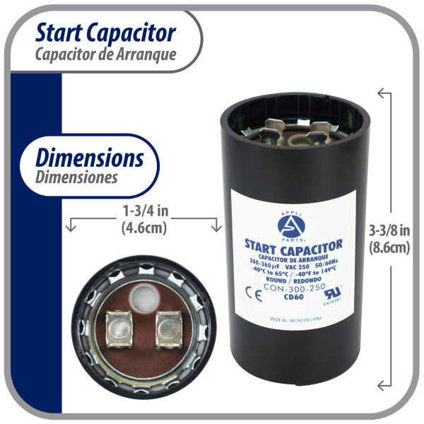 Appli Parts CON-300-250 Capacitor de Arranque 300-360 MFD (microfaradios) uF, 250 VAC. Universal para Motores Electricos, condensador de arranque de 4.6 cm de Diametro, 8.6 cm de Alto