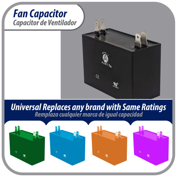 Appli Parts Condensador Capacitor de ventilador 1.5 mfd (microfaradios) uf 450VAC con conectores compatible con cualquier marca de igual capacitancia 3.4cm Ancho 1.4cm Profundidad 3.2cm Alto CAP-1.5-450