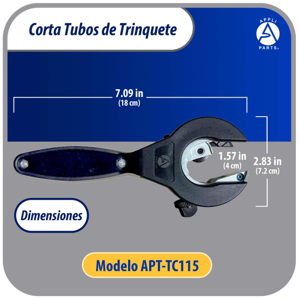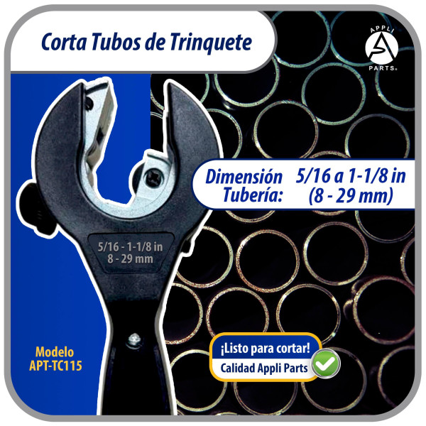 Appli Parts APT-TC115 Cortador de tubos con trinquete 5/16 a 1-1/8 in (8 a 29 mm) para cobre, aluminio, laton, acero inoxidable y PVC con cuchilla de repuesto diseno ergonomico y duradero