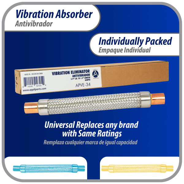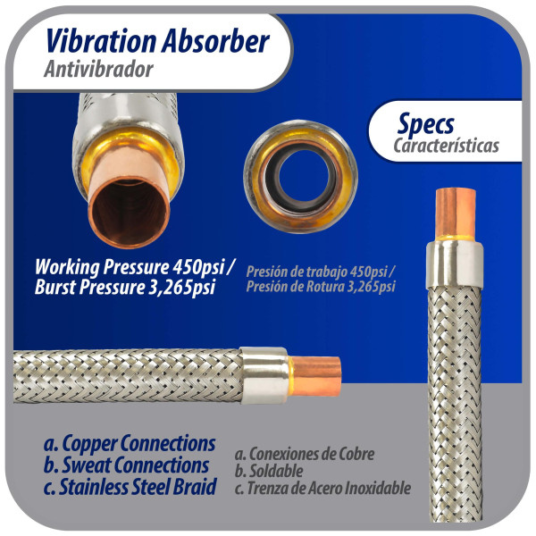 Appli Parts APVE-34 Antivibrador 3/4 pulg Soldable Eliminador de Vibracion 25cm Largo 450psi presion maxima de trabajo y 3.265psi presion de rotura