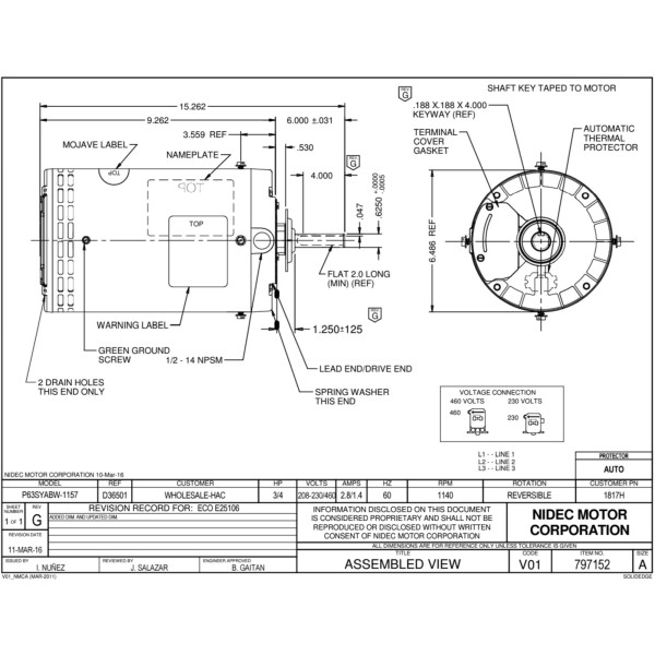 US Motors Mojave 3/4 hp 1140 rpm, 6 polos, 1 eje, OAO Cerramiento, 1 velocidad, 6.3 diametro, Reversible, 208-230 V/460 V, 60 hz, 3 ph, 1817H P063ABW1157015B X501